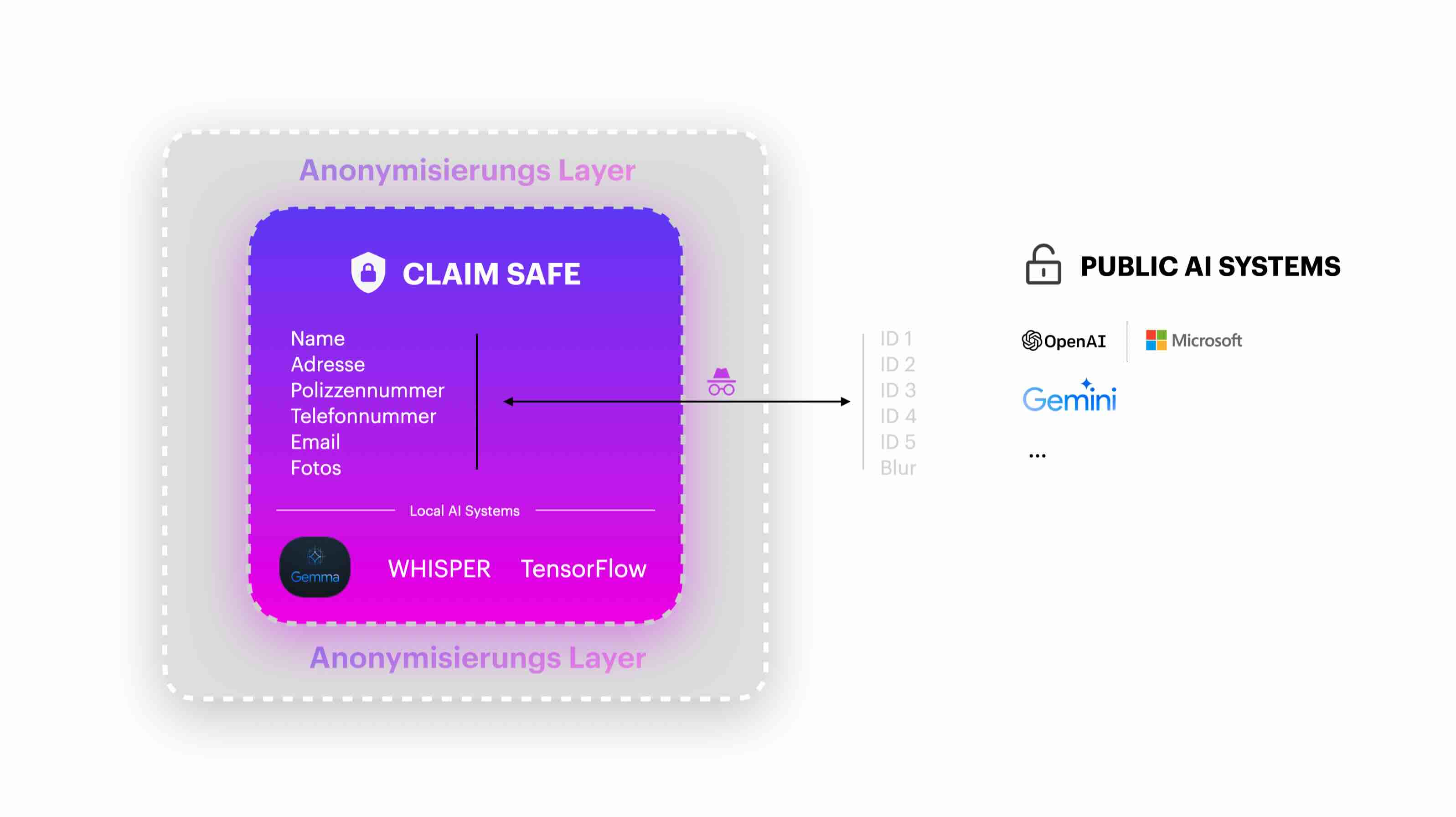 Datenschutz ist bei uns Standard. Wir arbeiten DSGVO-orientiert und richten unsere Prozesse am EU AI Act aus. Ein zentraler Baustein ist unser Anonymisierungslayer: Bevor Modelle Schadendaten auswerten (z. B. Fotos oder Dokumente), werden personenbezogene Informationen entfernt. Die Modelle erhalten ausschließlich sachbezogene Inhalte zum Schadensereignis. Die Ergebnisse werden anschließend in unserer Infrastruktur mit den Originaldaten zusammengeführt und als Gesamtbericht bereitgestellt. So kombinieren wir Datenminimierung, fachliche Aussagekraft und Auditierbarkeit.